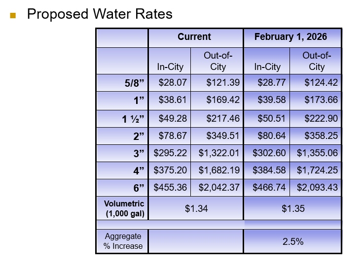 The Board of Aldermen will consider the First Readings of the applicable bills following this Public Hearing. If approved, the new rates would take effect on March 1, 2026.