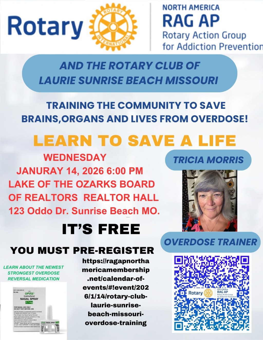 Pre-registration is required and the link is https://ragapnorthamericamembership.net/calendar-of-events/#!event/2026/1/14/rotary-club-laurie-sunrise-beach-missouri-overdose-training
