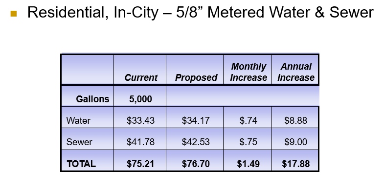 For most customers inside city limits, the monthly combined water and sewer bill increase is projected to be less than $5.00.